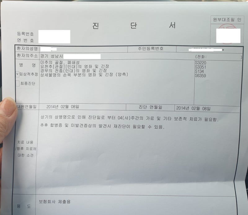 오늘은 주차장에서 넘어져 꼬리뼈가 부러진 보험이야기입니다.
